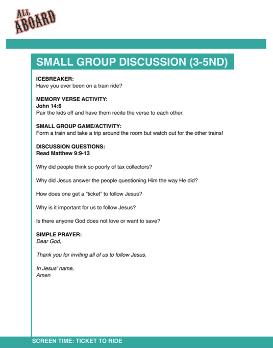 Small-Group Discussion - so you can find out who was paying attention and who was talking to their neighbor. Just kidding, this is a great way for you build deeper relationships with your kiddos after each lesson, which means you're going to care about them so much you'll cry like a baby when they graduate and go to middle school :(