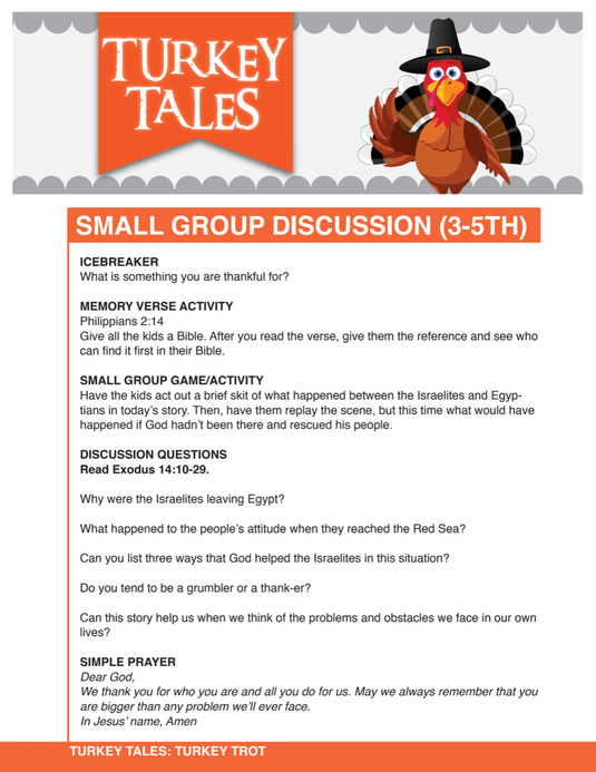 Turkey Trot – God frees His people from their slavery in Egypt. They respond by complaining constantly. The Israelites complain when they reach the Red Sea. Exodus 14